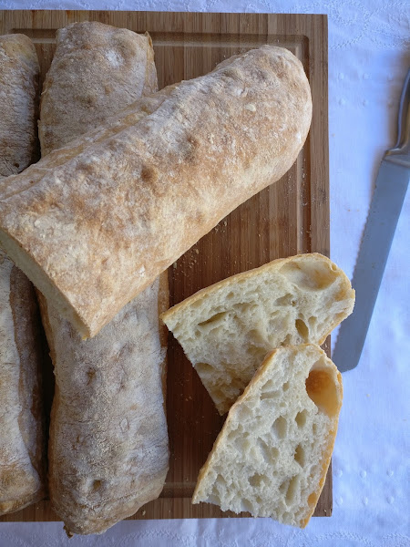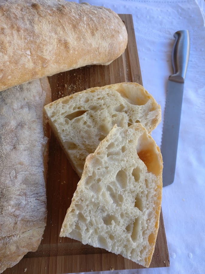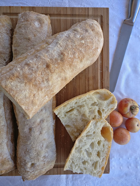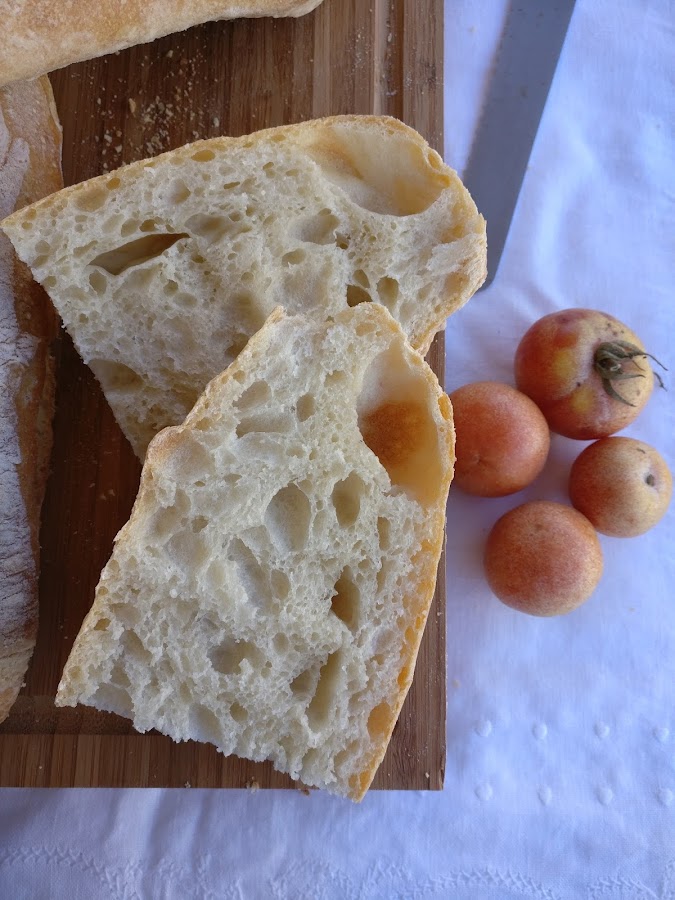 La masa debe parecer un colchón de aire, si no es así dejamos reposar media hora más. En cambio, si está lista, calentamos el horno a 250º. Un par de minutos antes de meter la masa en el horno, presiamos ligeramente con los dedos para conseguir que el alveolado sea más irregular. Deslizamos las chapatas sobre la bandeja de horno y las hornearemos a 250 º durante unos 15-20 minutos hasta que veamos que tiene color dorado. Cuando tengan ese color, bajamos la temperatura a 220 º hasta que, en total, lleve 35 minutos en horno. Entonces, lo apagamos y las dejamos dentro con la puerta entreabierta otros 10 minutos. Las sacamos y dejamos que se enfríen.