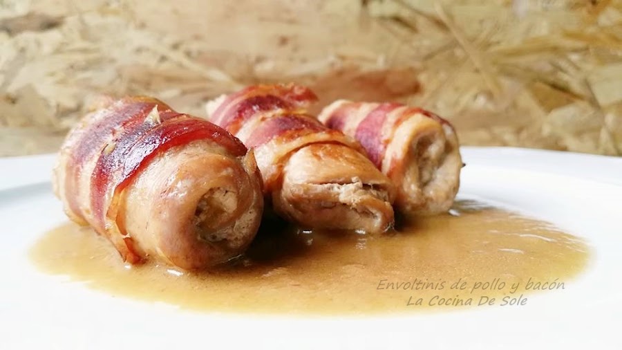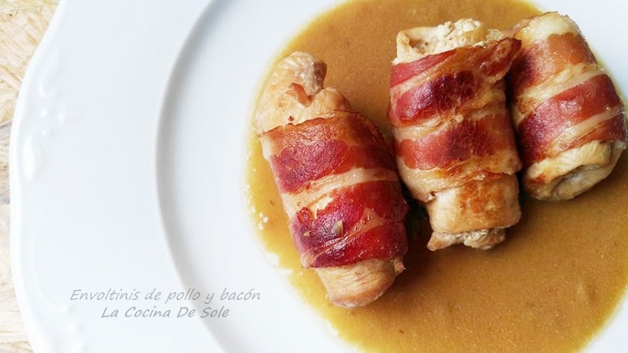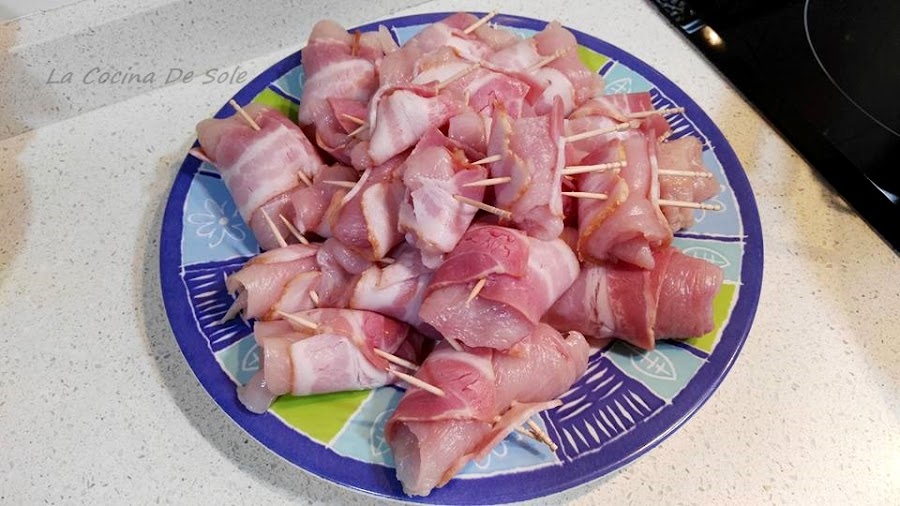 Enrollamos cada trozo de filete y luego envolvemos con bacón, pinchándolos con un palillo para que se una.