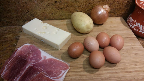 16-18 lonchas de jamón, 6 huevos, 1 trozo de queso emmental, 1 patata grande, 1 cebolla mediana y aceite de oliva.