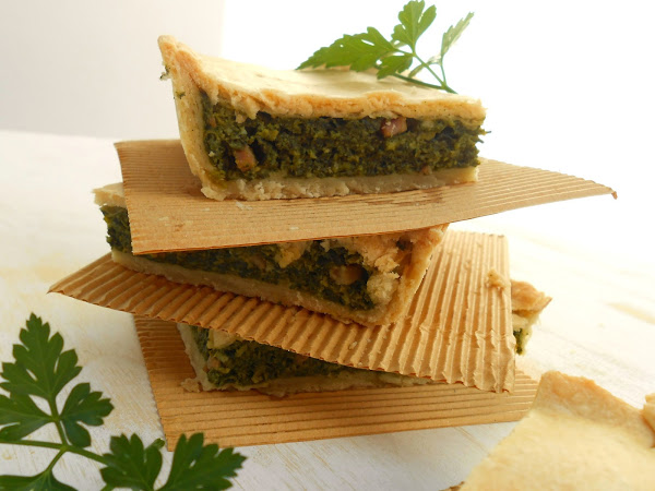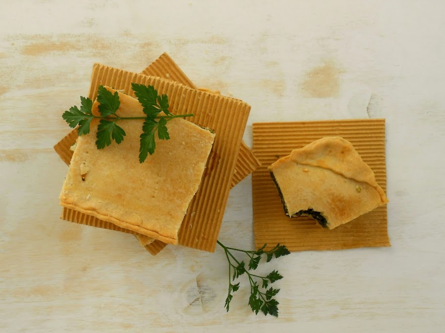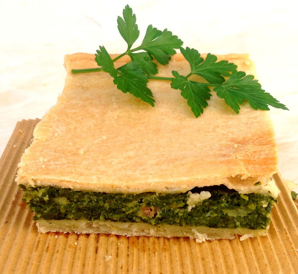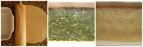 Un tercio de masa lo dejamos para hacer la cubierta y el resto de masa lo estiramos con rodillo sobre la encimera (mesada) dándole forma rectangular y dejándola bien fina. Colocamos en un molde engrasado con mantequilla y recortamos la masa sobrante. Estiramos el resto de masa de la misma manera. Ponemos el relleno en el molde y cubrimos, pegando bien los bordes para que no se abra al cocinarse. Pintamos con un poco de leche o con huevo batido y cocinamos en horno a 170º durante 35 minutos, o hasta que esté dorada.