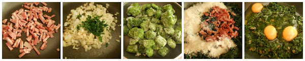 Ponemos a dorar el bacon en una sartén y cuando esté dorado lo retiramos y colocamos en un plato. En ese mismo aceite que queda en la sartén, cocinamos el ajo, la cebolla y el perejil. Añadimos la espinaca congelada y dejamos 5 minutos a fuego bajo. Dejamos enfriar y agregamos el bacon dorado, el pan rallado,el queso rallado, sal y pimienta. Removemos y añadimos los huevos incorporando bien. Reservamos.