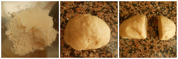 Debo aclarar que la receta del libro tiene un error puesto que pone que hay que usar 100 gr. de harina y 70 gr. de manteca de cerdo, me pareció que estaba mal, pero de todas formas en principio intenté hacerlo así, pero inmediatamente vi que eso no funcionaba así que le agregué más harina y agua hasta formar una masa suave que no se pega a los dedos. ( Me basé en esta receta) Dejamos reposar cubierta con un paño, durante 30 minutos.