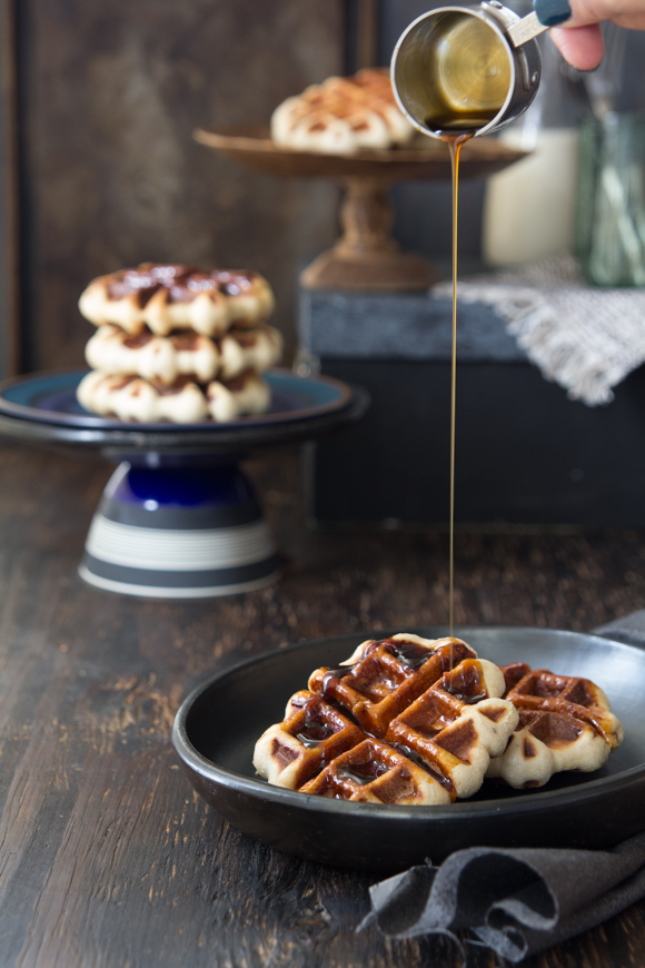 Al siguiente día la masa se separa en porciones, se aplanan un poco y se llevan a la plancha de waffles precalentada. Dos minutos después he obtenido los gwalffleados más hermosos y dorados que podría desear en la vida. Algunos los rocié con azúcar y otros con papelón granulado antes de cerrar la plancha. Los azucares se caramelizan y aportan un color dorado claro (con azúcar común) o dorado oscuro (al añadir papelón). Estos últimos con sabor un poco amargo y a caña de azúcar que me encantó.
