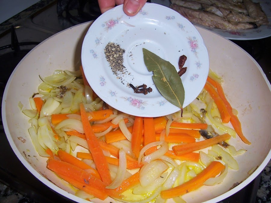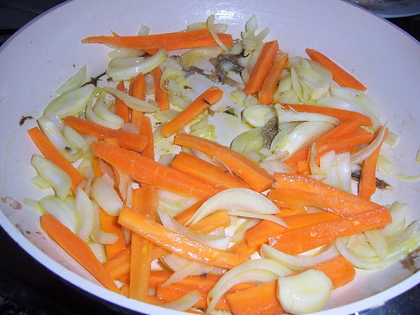 Lavamos y cortamos la verdura en tiras o rodajas y rehogamos unos 5 minutos en el mismo aceite que el pescado con la sal.