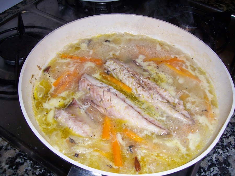 Añadimos las especies, el zumo de limón, el vino y el caldo de pescado y dejamos cocer unos 10 minutos.
