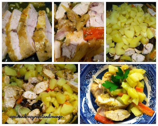 Continuamos con la receta y como ya hemos reservado solomillos de pavo para días posteriores en el tarro grande de cristal. Los 3 solomillos restantes los fileteamos a groso modo y dejamos en la cacerola junto con una poca de salsa (la mayoría de la salsa o líquido lo tenemos en el tarro de reserva) incorporamos unas patatas hervidas al vapor (yo como tengo thermomix las cociné al varoma unos 30 minutos vel.2 con 500ml. de agua en el vaso) Las incorporamos a la cazuela, ponemos sal a las patatas y removemos para que se impregnen del sabor del escabeche. Emplatar y a disfrutar!! Queda un plato completo, ligero, delicioso y saludable!! Con un fresco sabor a limón y una combinación agri-dulce que le proporciona las pasas y los orejones!!