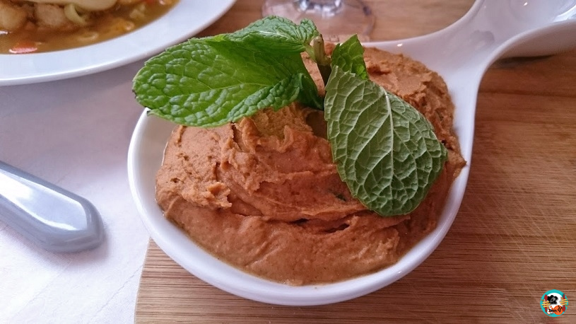 1.-Ponemos el gofio en un bol, le vamos añadiendo de a poco del caldo, mezclado con unas hojas frescas de hierbabuena. Lo amasamos hasta conseguir una mezcla homogénea. le añadimos el mojo rojo. Servimos el gofio con unas rodajas de cebolla roja remojada en vinagre.