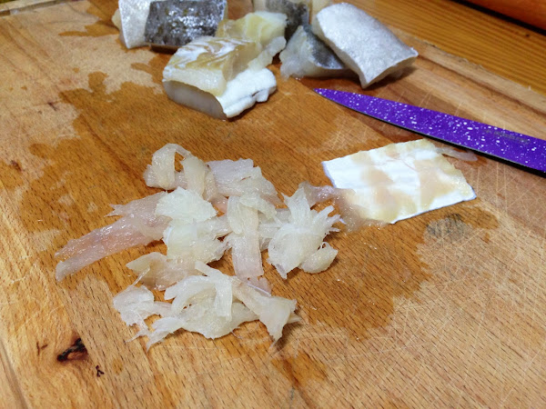 Si tenemos el bacalao con piel se la quitamos y nos aseguramos de que no quede ninguna espina.
