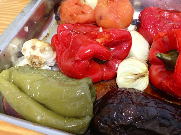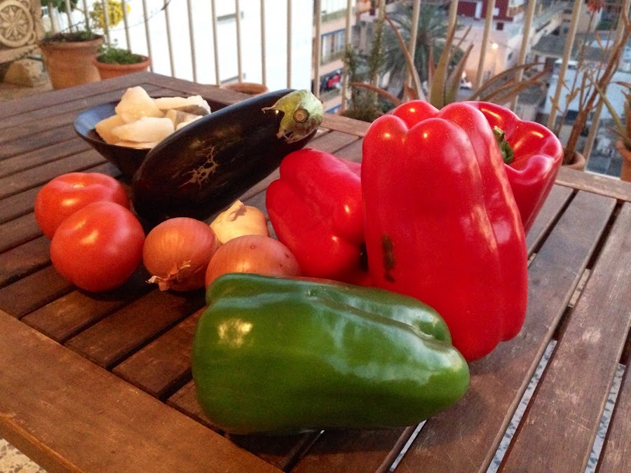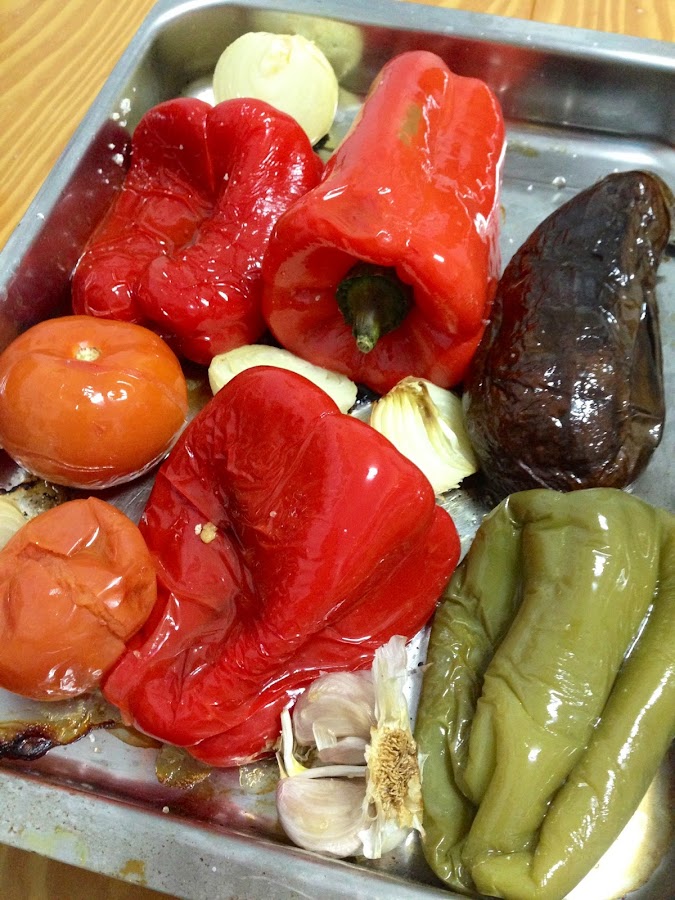 Lavamos y secamos los tomates, la berenjena y los pimientos. Pelamos las cebollas y separamos media cabeza de ajos y hacemos lo siguiente: