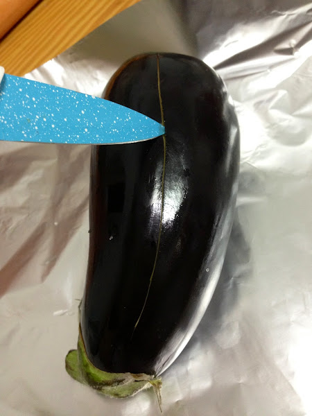 Con la berenjena también, aunque a la berenejena podemos pácticarle dos cortes de arriba a abajo para evitar que con la presión del calor del horno reviente. E igualmente aceite, sal y papel de alumnio.