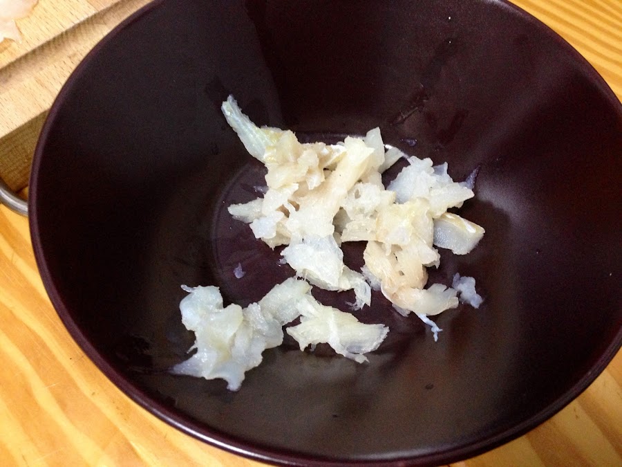 Una vez tenemos solo la carne del bacalao lo vamos desmigando con las manos y poniéndolo en un bol.