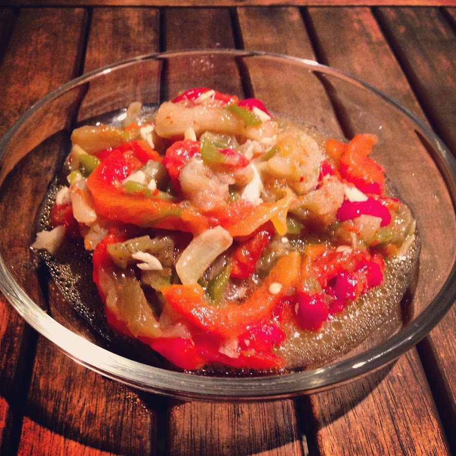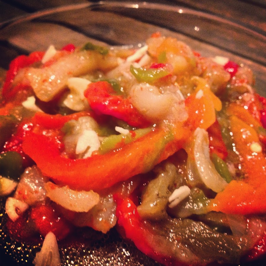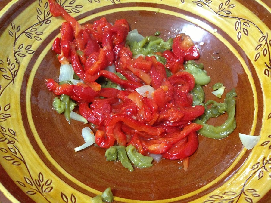 Pimientos: Les quitamos las pepitas, le quitamos la piel que debe salir bastante fácil y los troceamos a tiras.