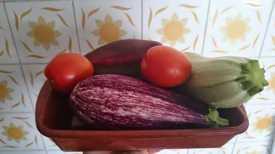 Cogemos el pimiento y lo lavamos, hacemos lo mismo con el calabacín, berenjena y los tomates, ahora cogemos un molde de barro o cristal para horno y ponemos la verdura dentro del cuenco, a la berenjena le haremos unos cortes con un cuchillo para que no explote (ponemos toda la verdura con piel), ahora cogemos y regamos por encima de la verdura con aceite.