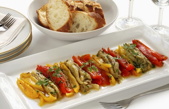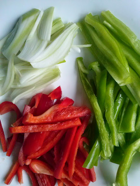 Precalentamos el horno a 180º, con calor en la parte superior e inferior. Colocamos todas las verduras en una bandeja de horno y las asamos durante una hora. Dejamos enfriar y cuando estén templadas, las pelamos las verduras y las cortamos en tiras, en juliana.
