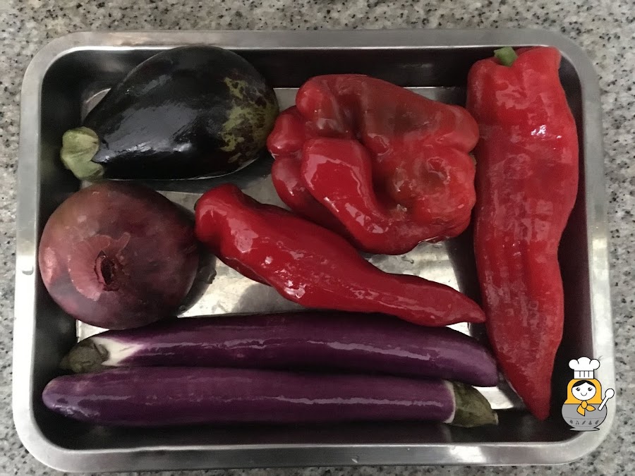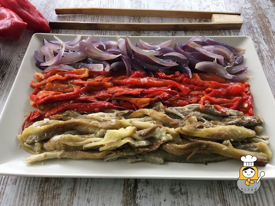 Encendemos el horno a 200ºC. Lavamos bien las verduras y las secamos. Disponemos en una bandeja de horno las berenjenas, los pimientos y las cebollas. Con ayuda de un pincel de silicona, barnizamos con aceite las berenjenas y los pimientos. Introducimos la bandeja en el horno y asamos las verduras unos 45 minutos, girándolas cada poco para que se asen uniformemente.