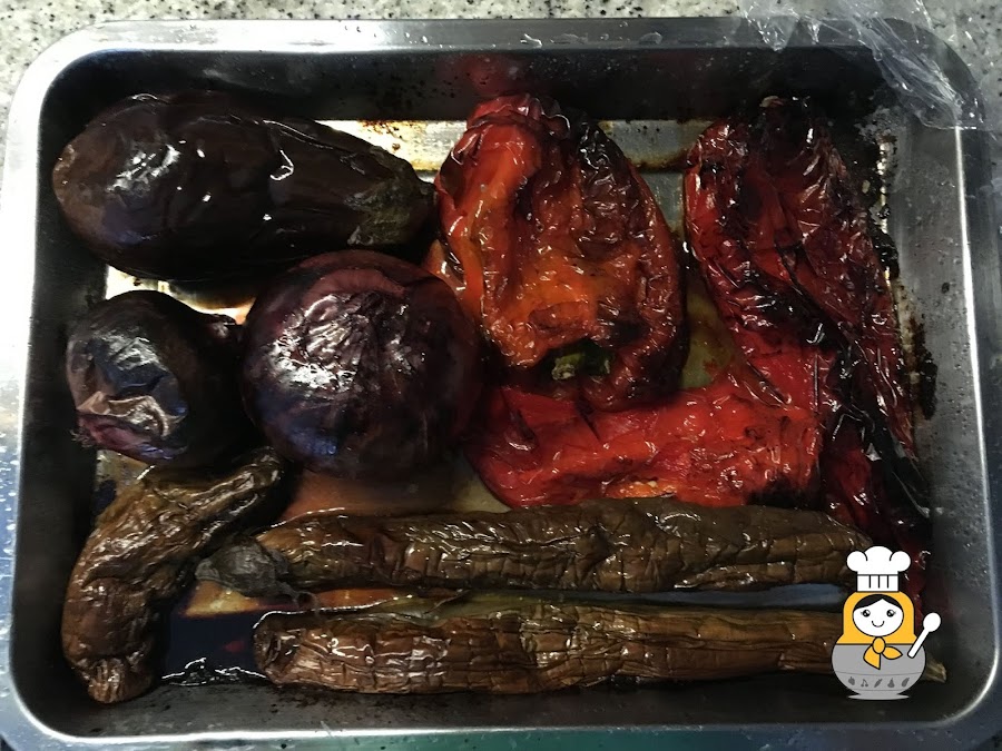 Cuando las verduras estén bien tostadas (que parezcan casi quemadas), las retiramos del horno y cubrimos la bandeja con papel film, para que suden mientras enfrían y sea mucho más fácil pelarlas. Una vez hayan enfriado, retiramos el papel film y pelamos las verduras, veremos como la piel se desprende fácilmente. Con las manos mojadas en agua, retiramos con cuidado las semillas del pimiento.