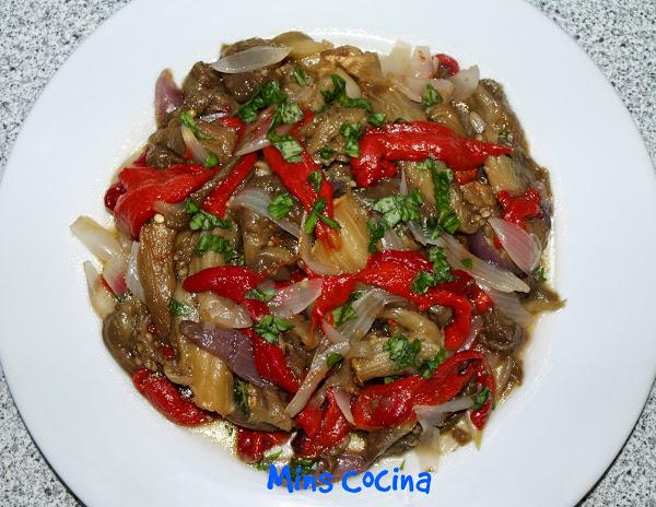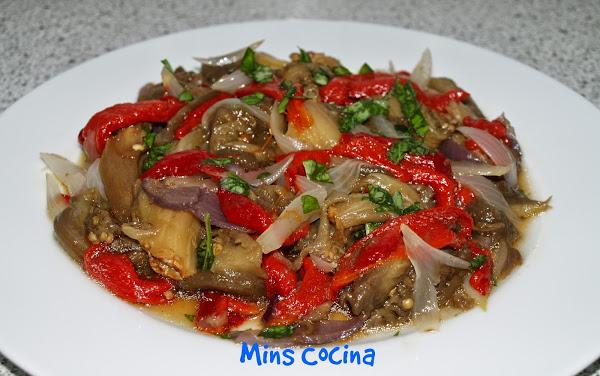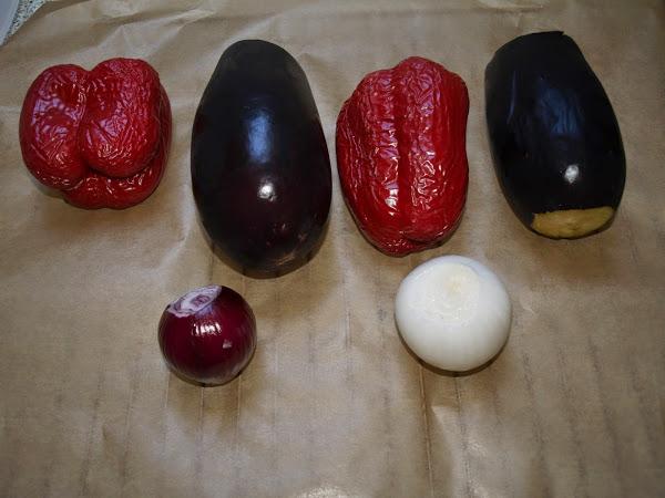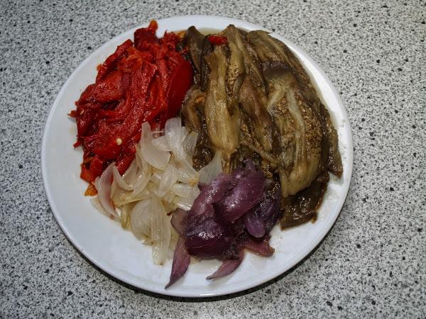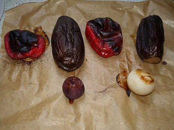- Este plato es muy sencillo y todo lo que tiene es asar las verduras. Normalmente yo corto la berenjena en lonchas. Después las pongo un rato en agua con sal para que suelten el amargor (o no, a mí no me amargan, no me preguntéis porqué... hasta ese punto me gustan! =D ). Las pongo en una bandeja junto con la cebolla en tiras, con un poquito de aceite y las aso. Esta vez iba con mucha prisa, tenía mil cosas que hacer y no podía entretenerme, así que las metí enteras en el horno. Hice unos cortes con un cuchillo, para que se hicieran bien y nada más. Las metí junto con los pimientos enteros (estos siempre los aso así) para que "sudaran" y las cebollas. Quedaron genial.