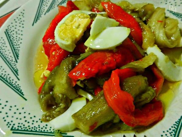 Cortamos en tiras largas, aliñamos con aceite y sal y ponemos el huevo duro cortado en rodajas por encima.La Escalivada es un plato típico de Cataluña, Valencia y Aragón, su nombre proviene del verbo catalán "escalivar" que significa asar al rescoldo.