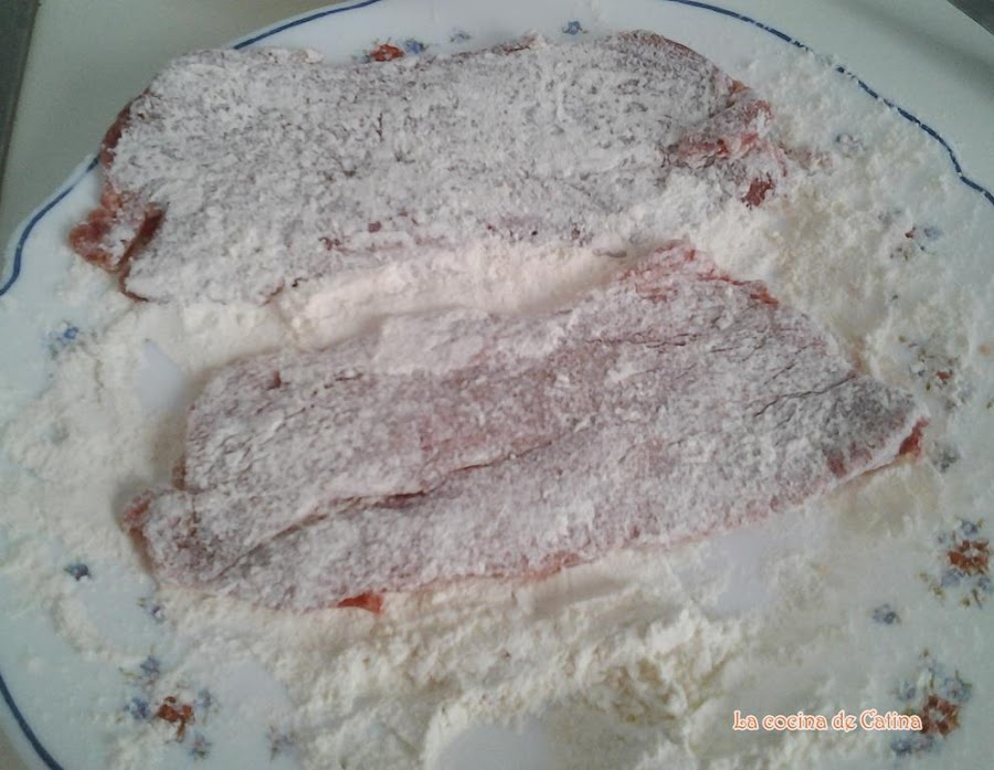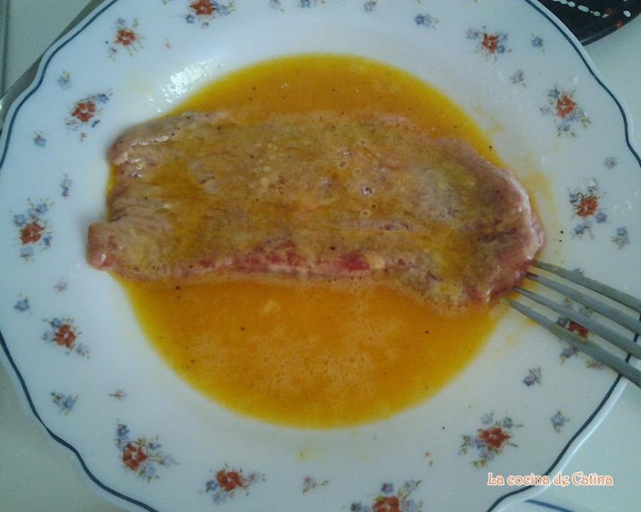 Enharinar la carne, sacudirla para quitar el sobrante y pasarla por la mezcla de huevo y finalmente por pan rallado.