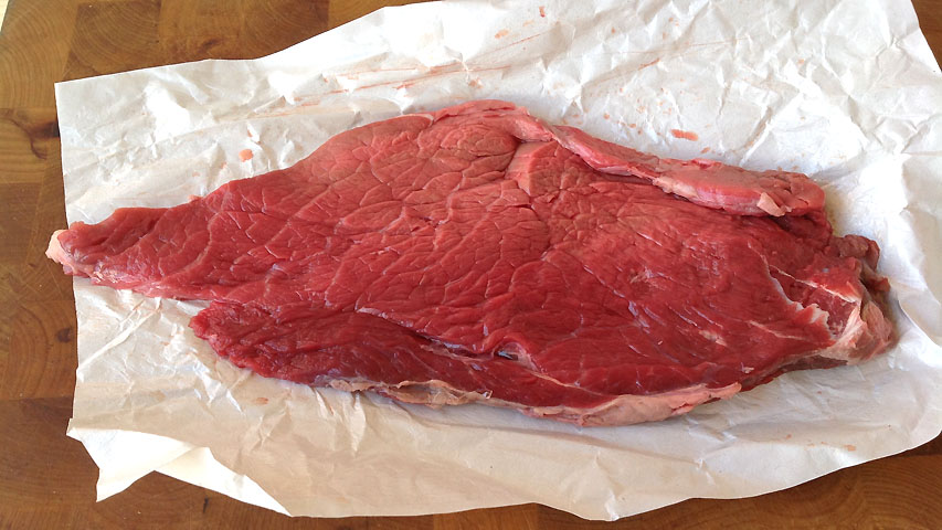 Este es el filete de ternera con el que voy trabajar. Es un filete de tapa aunque podría ser otra pieza. Su grosor es de medio centímetro, un dedo.
