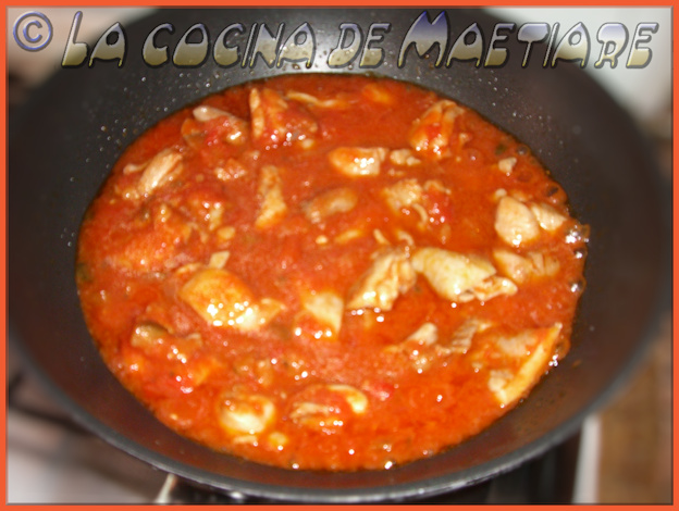 En éste punto añadimos el pisto al wok y remover bien. Cocinar a fuego medio, tapando el wok y removiendo de vez en cuando durante unos 3 minutos. Destapar y cocinar 2 minutos más para que la salsa espese un poco.
