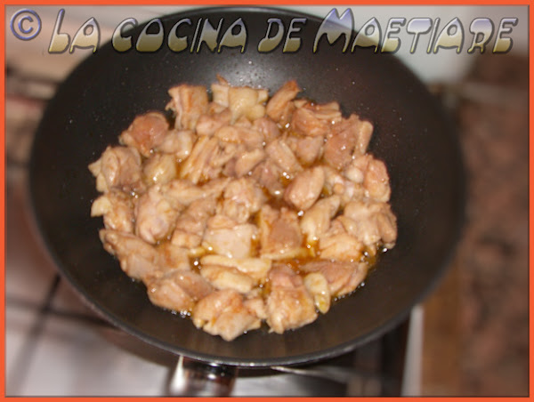 En un Wok ponemos a calentar aceite de oliva virgen. Cuando haya cogido algo de temperatura sofreír el pollo hasta que coja un ligero todo dorado .