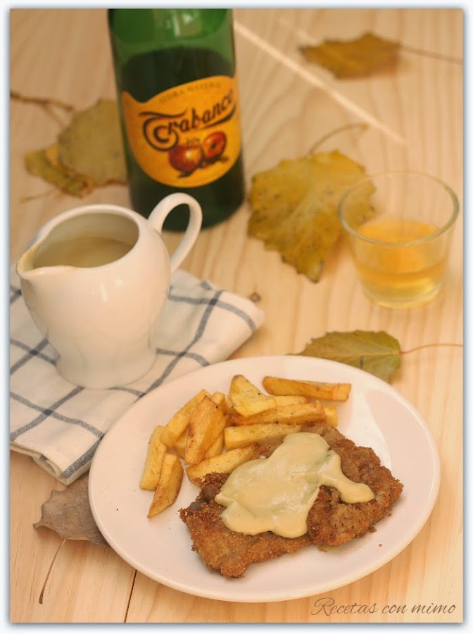 6 - Servimos los escalopines con la salsa y las patatas... queda perfecto si lo acompañamos de un sidriña escanciada y bien fría.