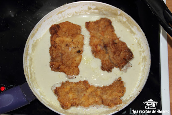 Transcurrido el tiempo, sacamos los escalopines, los escurrrimos por harina, huevo y pan rallado.