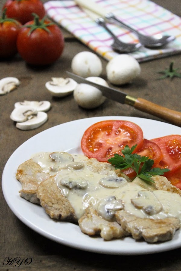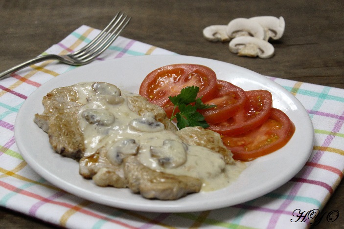 4. Servimos unos tres o cuatro escalopines por persona, regados con la salsa de champiñones y acompañados de una buena ensalada.