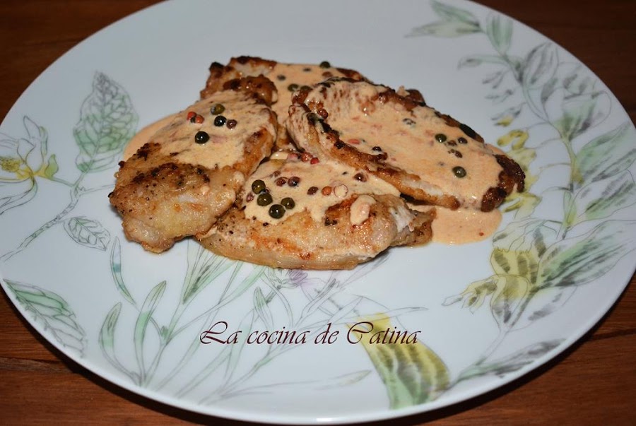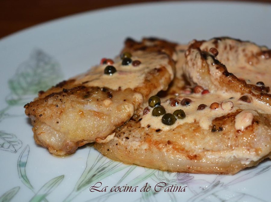 Servimos los escalopines de cerdo bañados con la salsa muy caliente.