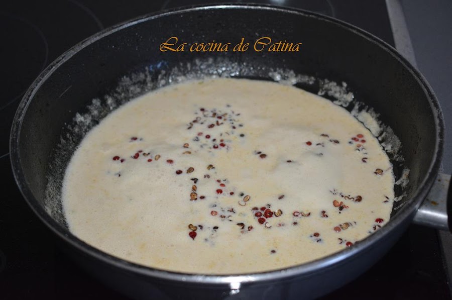 Retiramos la grasa de la sartén, vertemos la nata (crema de leche) líquida y dejamos reducir un poco.