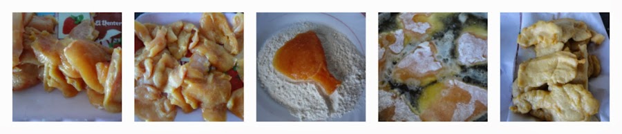 Comenzamos limpiando de grasa las pechugas de pollo y las cortamos en escalopines. Salamos y pasamos por harina.