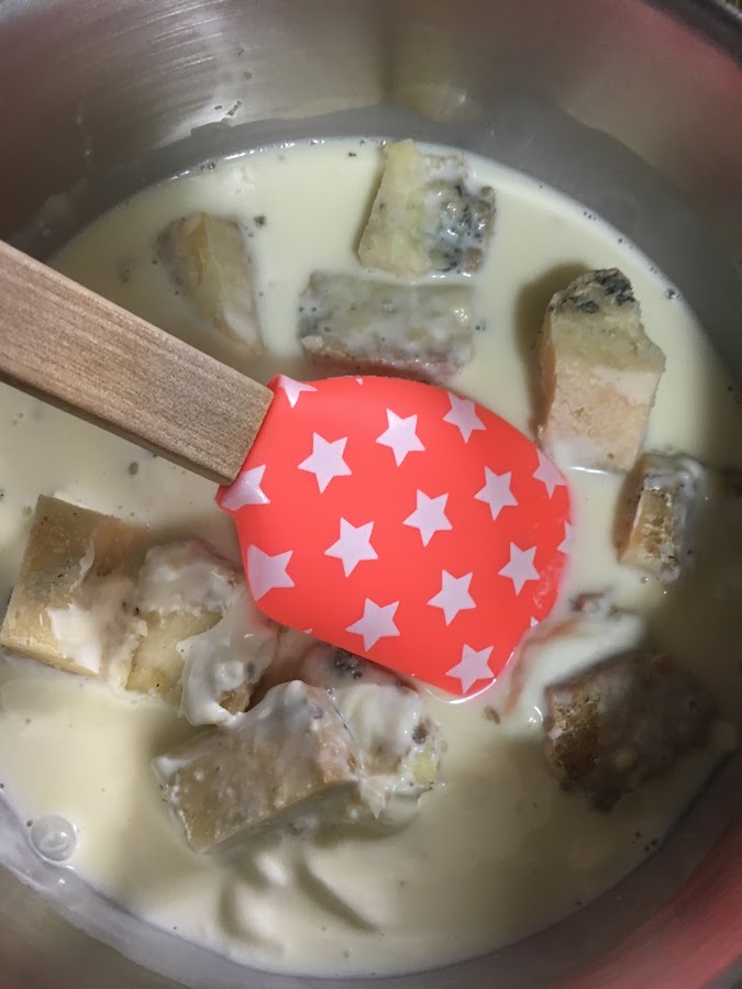 Se pone a fuego no muy alto y se deja que se deshaga el queso y se mezcle con la nata (crema de leche). Podemos remover con una espátula.