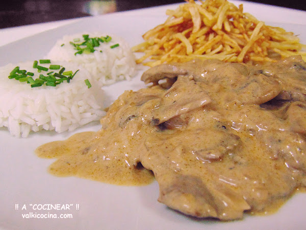 Originario de Rusia, este plato típico consiste en tiras de filetes de ternera cocinadas en una sabrosa salsa ( que habitualmente lleva setas u hongos y mostaza entre otros ingredientes ), .. y que se sirve sobre arroz blanco o pasta.
