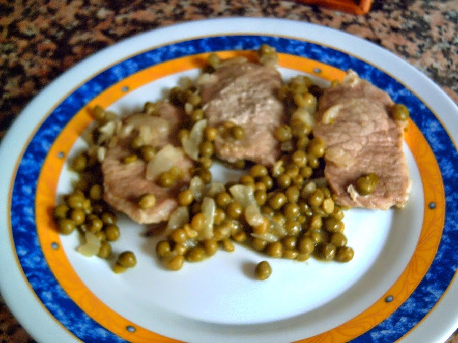 Picamos muy fina la cebolla y la rehogamos en una sartén grande con un poco de aceite. Cuando esté transparente echamos una cucharada de harina de maíz y los guisantes. Rehogamos para que se mezclen bien. Colocamos los escalopines encima, añadimos los dos vasos de vino y más o menos la misma cantidad de agua para que se quede todo cubierto. Fuego fuerte unos 20 minutos hasta que casi todo el líquido se haya consumido. Servir en un plato o en una bandeja.