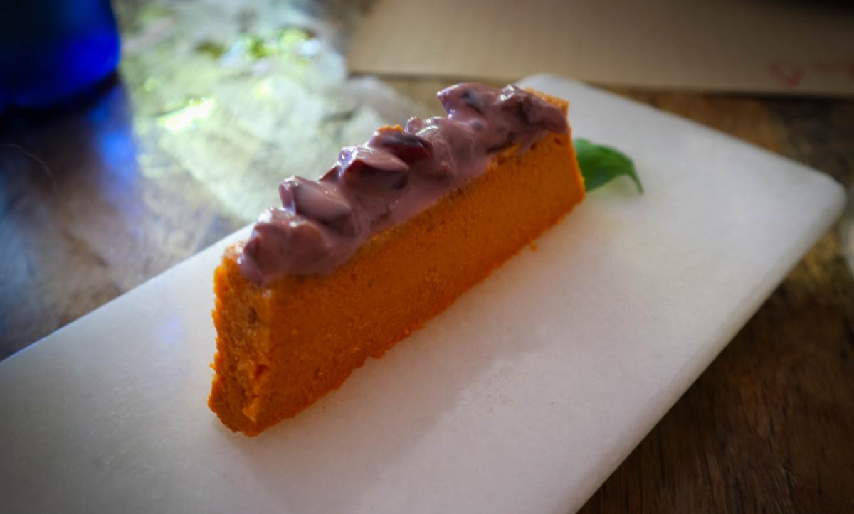 Aperitivo para cada mesa: pastel de chorizo con mousse de cerezas. Atención a los emplatados: menos es más siempre y en la carta ni te cuento, pero de la carta hablamos al final.
