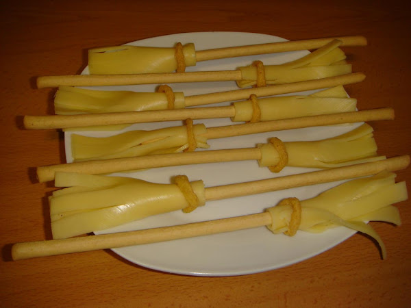 Se cortan las lonchas de queso haciendo tiras verticales sin llegar hasta el final, para que no se rompan las lonchas. Enrollamos a un palito de pan con cuidado y las sujetamos con los aritos de patata. Muy fácil y muy divertidas!!