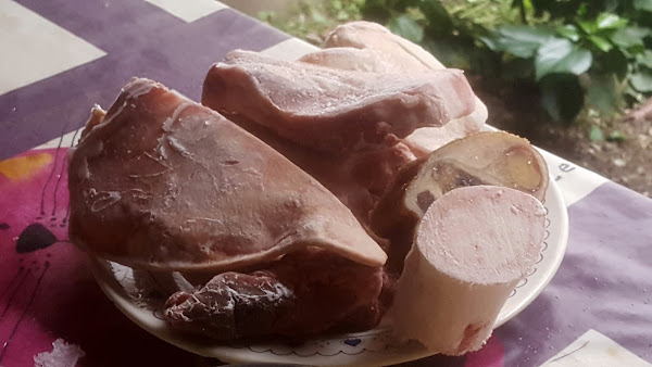 En el fuego ponemos a cocer una olla con los 5 litros de agua fría y añadimos, los huesos y las carnes excepto el morcillo que añadiremos más tarde. Agregamos también las verduras que hemos lavado y dejamos que hierva.