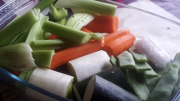 Lavamos bien todos los huesos y carnes. Reservamos. Pelamos las zanahorias, la cebolla, el nabo y el puerro. Despuntamos las judías verdes. Lavamos bien junto con las ramas de apio y el calabacín y cortamos en trozos un poco grandes.