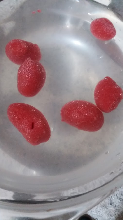 Ahora, nos ponemos a hacer la mezcla que queramos. Empezamos por la de frambuesas. para que se formen las esferas, tenemos que usar Gluconolactato o Cloruro Cálcico (se suele recomendar unos 20g por K de preparación), en el caso del las de yogurt, no hace falta, porque ya tiene suficiente calcio. Lo primero que vamos a hacer es batir las frambuesas con el azúcar, la goma xantana y el gluconolactato. La Xantana es para darle un poco más de cuerpo, pero las próximas intentaré hacerlas sin ella. Trituramos todo con la batidora y lo colamos. Para hacer las esferas,yo usé una cuchara, para las siguientes, me compraré unas cucharitas medidoras, que salen más redonditas y más bonitas. Cogemos una cucharada de mezcla y la ponemos con cuidado en la mezcla de Alginato, la última foto muestra el momento jaja, es algo extraño no??, parecen embriones, podemos poner varias esferas a la vez. Los dejamos reposar unos 3 minutos. Ahora, con una cuchara especial (es una cucharita con agujeros) se recogen las esferas y se ponen en el baño de agua, las dejamos unos minutos, las volvemos a recoger con la cuchara, se escurre un poco y listo para servir!!