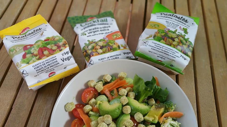 Para acompañar el pollo rebozado he preparado una ensalada de espinacas con tomate cherry, aguacate, brocoli y zanahoria, además le he añadido unos picatostes sin gluten, leche ni huevo de ajo y perejil que le han dado un toque super rico