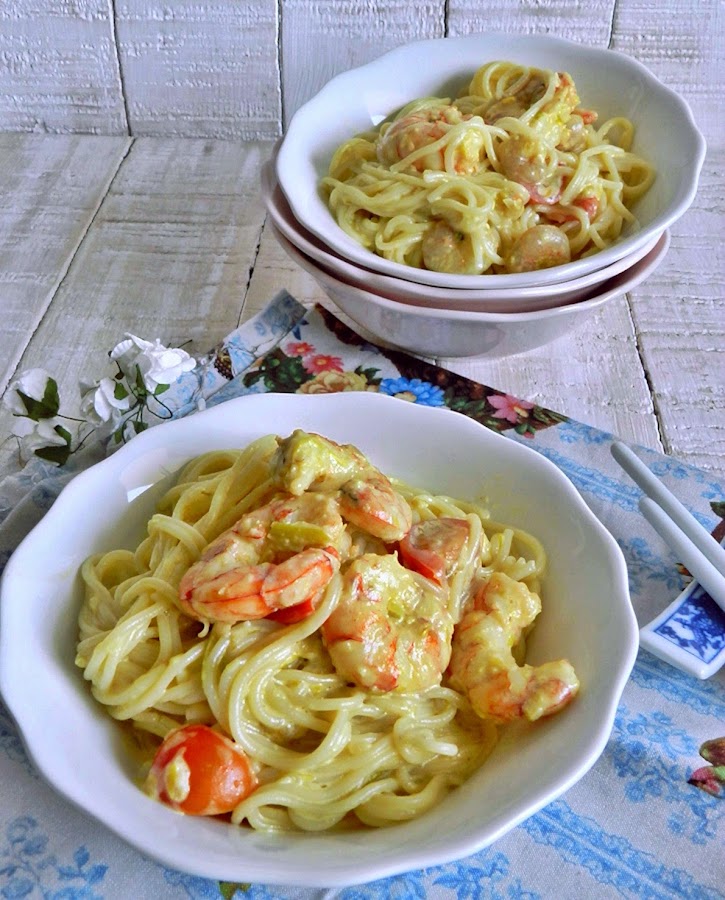 Añadimos la nata (crema de leche) y dos cucharadas de curry en polvo. Removemos bien para que se mezcle y cocinamos un par de minutitos.