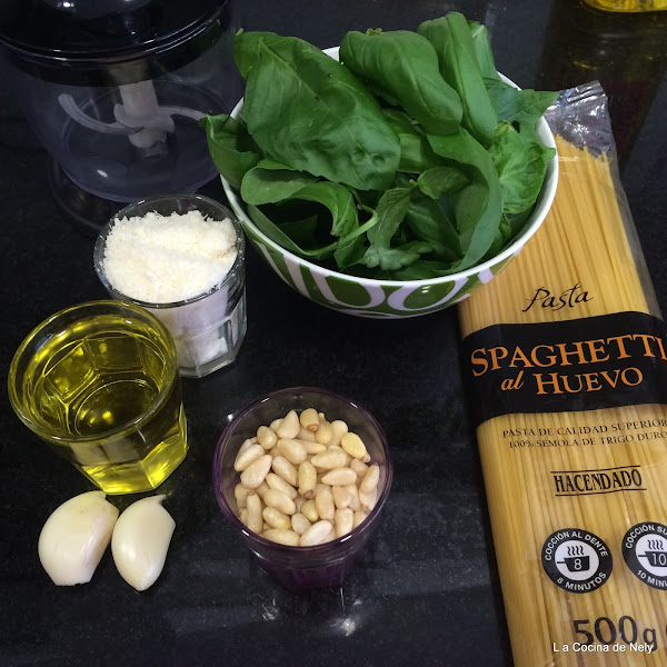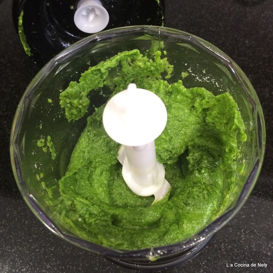 Poner a batir la albahaca,los piñones,el queso, un diente de ajo y una pizca de sal.