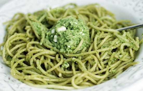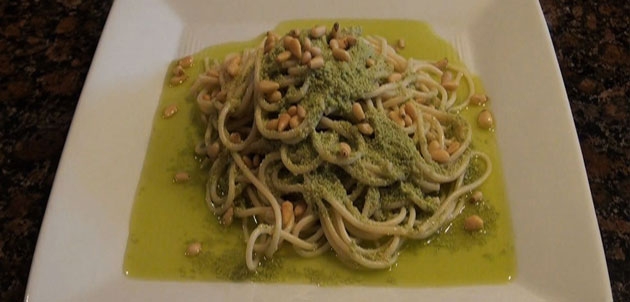A parte cocer la pasta, con agua y sal, (1 litro de agua por 100g de pasta). Escurrirla cuando esté cocida, guardando un par de cucharadas del agua de cocer. Añadirlas a la pasta escurrida, junto con la salsa (pesto) que hemos preparado en el mortero, el resto del pecorino y mezclarlo todo.