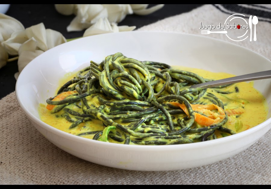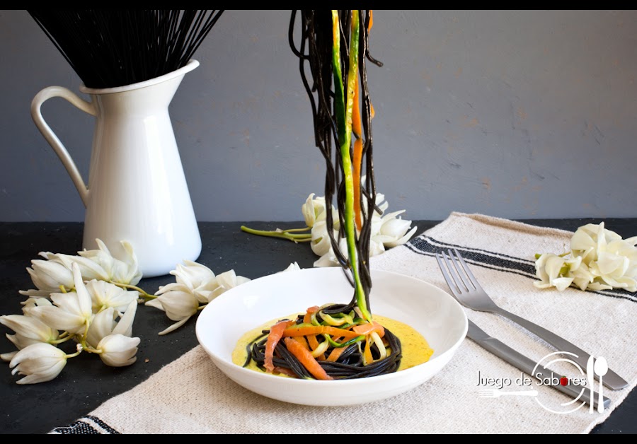 La mayoría de recetas de espaguetis negros suelen hacerse con sepia y gambas. Es un clásico, muy rico por cierto. Nosotras hemos intentado variar. A partir de unos Spaghetti Sepia Premium que nos enviaron los responsables de Pastas Alimenticias Romero S.A. de Daroca, Zaragoza, hemos hecho unos espaguetis vegetales, de calabacín y zanahoria, a los que hemos añadido unas pequeñas tiras de salmón ahumado y lo hemos presentado todo sobre una base de salsa al curry. En la vida habíamos juntado estos ingredientes pero el resultado nos sorprendió gratamente, por lo cual repetiremos el experimento en breve.