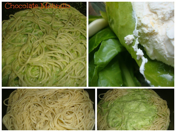 Fundimos un poco de mantequilla en una cacerola y agregamos la pasta, enseguida la salsa de espinacas, crema y ajo, sazonamos con sal, pimienta y nuez moscada y mezclamos bien, sin romper la pasta, con mucho cuidado. Cocinamos a fuego bajo, si es necesario podemos añadir un poco de líquido de cocción de la pasta, o bien otro poco de leche. Eso si lo creemos necesario. Incluso, se puede colocar un poco de queso rallado encima.
