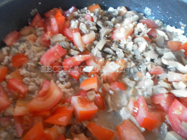 Esperamos 5 minutos a que se reduzca el alcohol, momento en el que agregamos los tomates cortados en dados y los champiñones en trozos pequeños. Espolvoreamos con orégano y dejamos cocer a fuego lento durante 40 minutos.