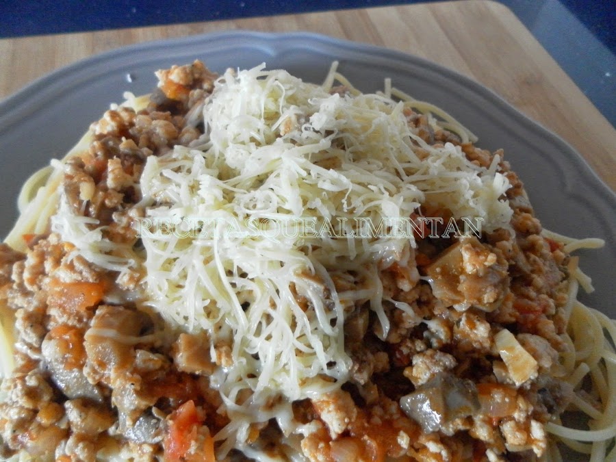500 gr. espaguetis, un kg. carne de ternera picada, 150 gr. queso, 3 tomates maduros, 2 cebollas, 2 dientes de ajo, 400 gr. champiñones, orégano, aceite de oliva, pimienta negra molida, sal, agua.