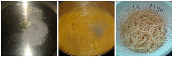 Después, pasamos la pasta por un escurridor, para quitarle el agua de cocción (si no queréis que una vez escurridos los espaguetis se os peguen, ver este truco).