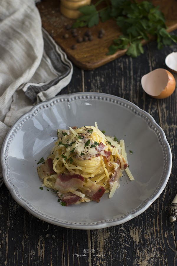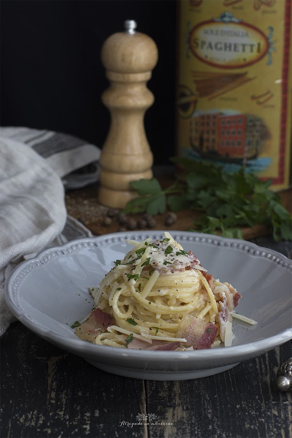 La salsa carbonara con nata (crema de leche) es una versión bastante extendida en nuestro país, y aunque dista un poco de la auténtica, la verdad es que está riquísima.